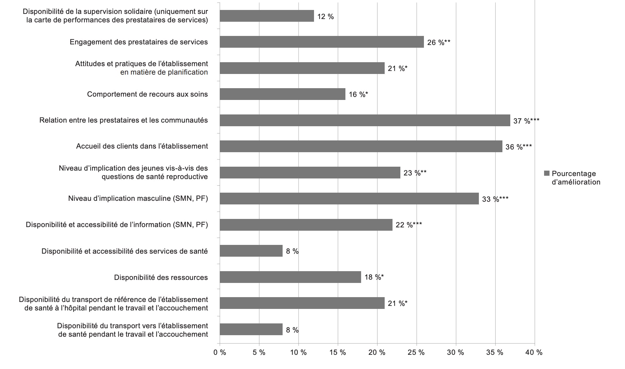 Les interventions en matière de responsabilité sociale ont permis aux services de planification familiale de mieux répondre aux besoins des clients. Dans toutes les interventions de responsabilité sociale, les prestataires et les clients ont fait état d’améliorations des services. Dans une étude menée au Malawi, les communautés et les prestataires ont identifié les problèmes à traiter, se sont mis d’accord sur des indicateurs de progrès et se sont réunis tous les six mois pour mesurer ces progrès via la carte communautaire de performances CCP. Des améliorations ont été constatées pour les 13 indicateurs de la carte communautaire de performances sur une période de deux ans, 10 d’entre elles étant statistiquement significatives (Figure 2).19 Par exemple, les communautés et les prestataires ont noté des améliorations statistiquement significatives dans les relations entre les clients et les prestataires, dans l’accueil des clients, l’implication des agents de santé, le niveau d’engagement des hommes et la participation des jeunes, ainsi que la disponibilité et l’accessibilité de l’information.